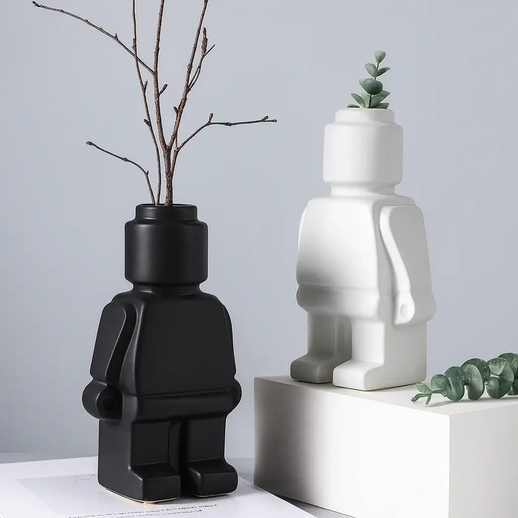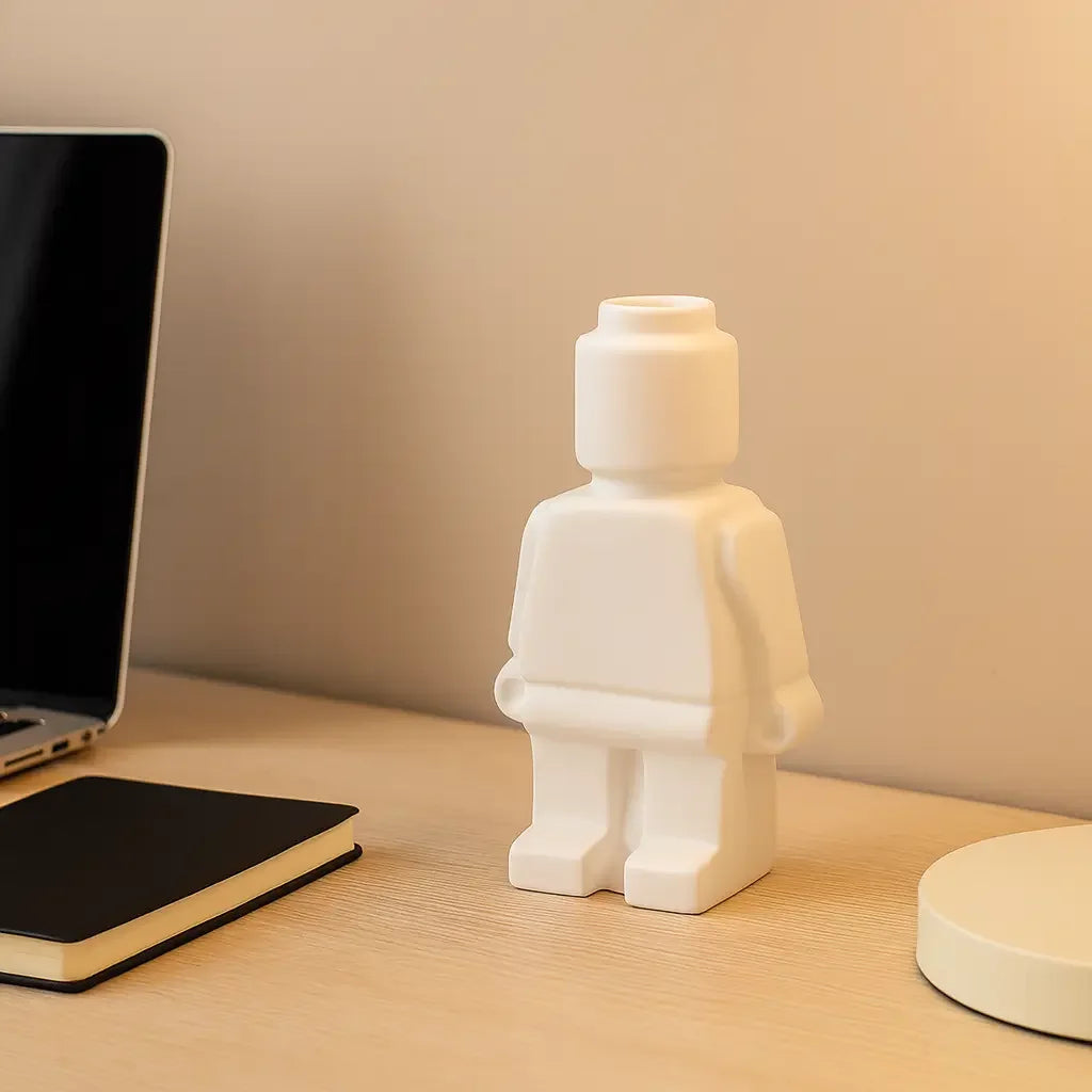 Seu design lúdico, quase arquitetônico, faz referência a figuras humanas simplificadas e blocos sólidos — um contraste entre o orgânico da planta e a rigidez da forma.